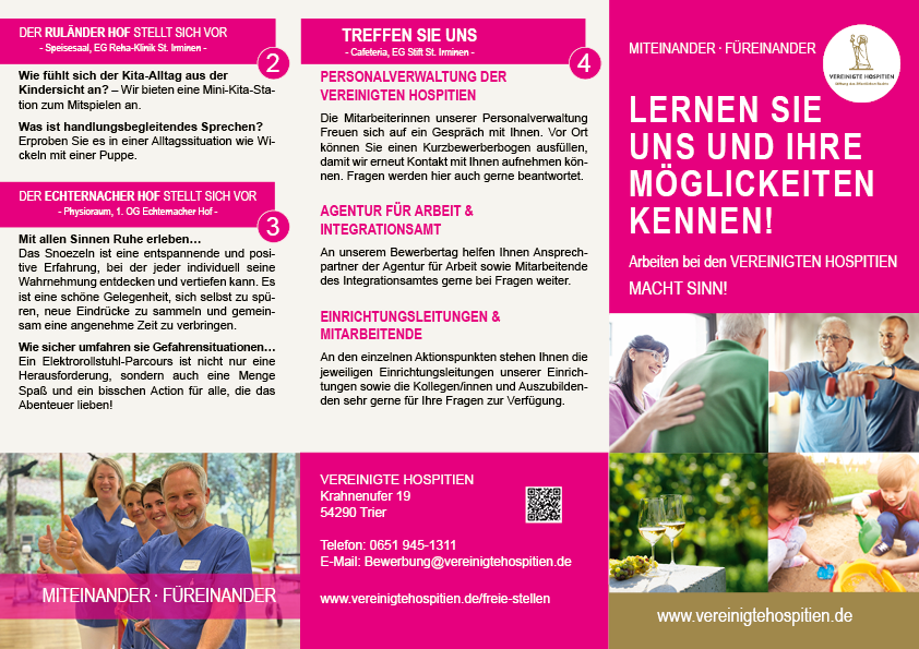 In der Cafeteria des Stift St. Irminen freuen sich die Mitarbeiterinnen der Personalverwaltung auf ein Gespräch mit Ihnen. Dort finden Sie ebenfalls die Ansprechpartner der Agentur für Arbeit sowie Mitarbeitende des Integrationsamtes. An den einzelnen Aktionspunkten stehen Ihnen die jeweiligen Einrichtungsleitungen unserer Einrichtungen sowie die Kollegen/innen und Auszubildenden sehr gerne für Ihre Fragen zur Verfügung.